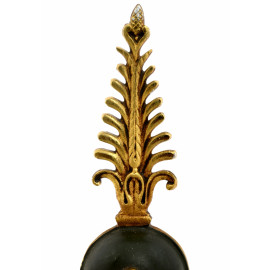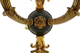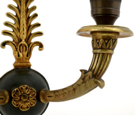Coppia di applique stile impero a due luci in metallo dorato e laccato nero, XX secolo, cm 34x17x10, (difetti)