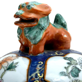 Coppia di cachepot in ceramica policroma con decori floreali a rilievo con coperchi con presa a guisa di cane di Pho, XX secolo, Cina, XX secolo, altezza cm 47,5, (sbecattura e lievi difetti)