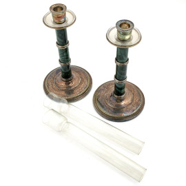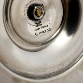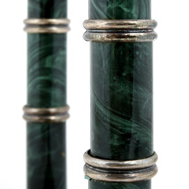 Coppia di candelieri in silverplate Micron con deecorazione al fusto a guisa di malachite, XX secolo, altezza cm 23, (difetti)