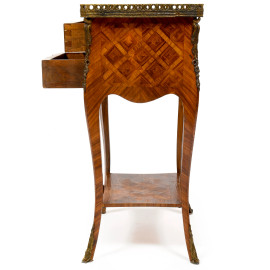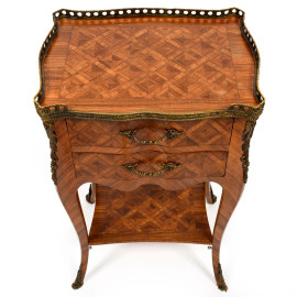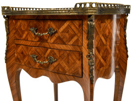 Coppia di comodini impiallacciati in satinwood con piano rettangolare con motivo a scacchiera e perimetro traforato in bronzo. Fronte scandito da coppia di cassetti a colonna e gambe mosse con intarsi in bronzo raccordate da ripiano con motivi a scacchiera, XX secolo, cm 72x44x33, (difetti)