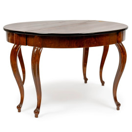 Coppia di consolles in noce con tre gambe mosse, XX secolo, cm 72,5x114x62, (difetti)