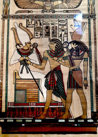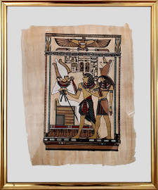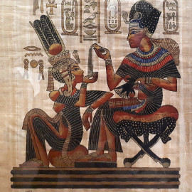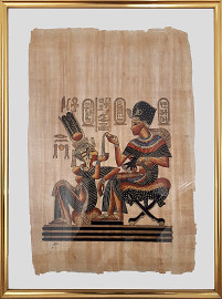 Coppia di dipinti egizi vintage su stuoia naturale, cm 64x44 e cm 44x34, con cornici