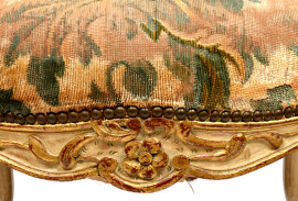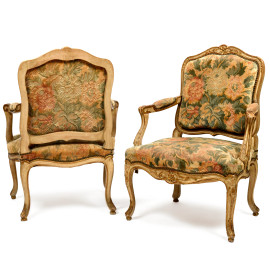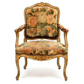 Coppia di poltrone in legno laccato e dorato con tappezzeria in tessuto a decori floreali, XIX secolo, altezza cm 94, (segni di usura)