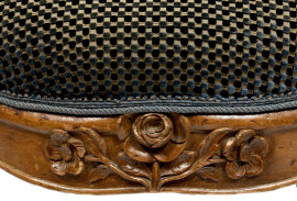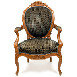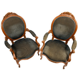 Coppia di poltrone in noce con schienale ovale e intagli apicali floreali. Seduta, schienale e braccioli in tessuto imbottito, XIX secolo, cm 101,5x66,5x54, (segni di usura del tempo)