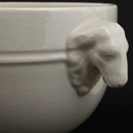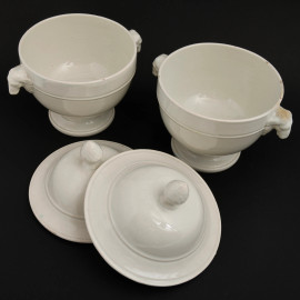 Coppia di potiche in porcellana vianca con prese laterali a montone. Coperchio con elemento apicale a pomo. XX secolo, cm 23x18x22 (segni di usura)
