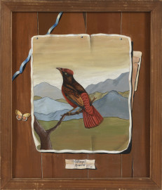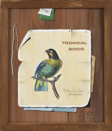 Coppia di trompe l'oeil raffiguranti volatili, XX secolo, tempera su compensato, cm 48x40,5, entro cornice