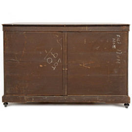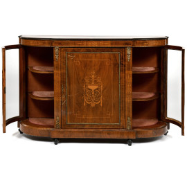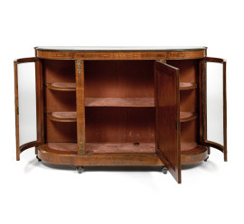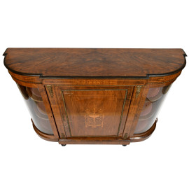Credenza inglese in radica e intarsi in bosso con profilo laccato nero e inserti bronze. Sportello centrale affiancato da ante convesse a vetrina contenenti vano a triplice ripiano, XIX - XX secolo, cm (105x147x36,5 (lievi segni di usura)
