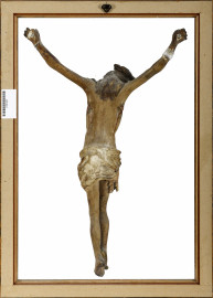 Cristo in papier machè fissato su plexiglass entro cornice, XIX secolo, misure totali cm 58,5x41, (difetti e rotture)