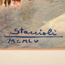 Festa di paese, tecnica mista su carta, cm 31x23, firmato e datato "MCMLV" in basso a sinistra, entro cornice