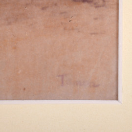 Fiorenzo Tomea, Scorcio di via con alberi, tecnica mista su carta, cm 14,5x11,5 entro cornice. Al retro dichiarazione di autenticità della moglia dell'artista