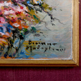 Fiori, olio su compensato, XX secolo, firmato in basso a destra, cm 8x13,5, entro cornice