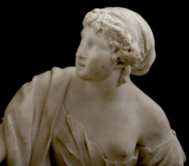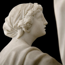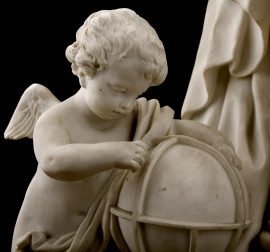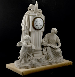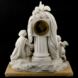 Gruppo allegorico in biscuit con quadrante circolare smaltato con numeri arabi Planchon à Paris, XX secolo, cm 44x40,5x21 (assenza di meccanismo)