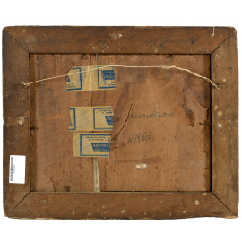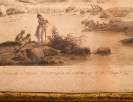 Incisione raffigurante scorcio fluviale con personaggi e città sullo sfondo, XIX secolo, cm 26x34 entro cornice, (gore, piegature e difetti)
