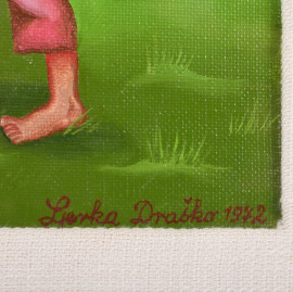 La raccolta delle mele, olio su tela, cm 29x19, entro cornice, XX secolo, firmato e datato 1972 in basso a destra