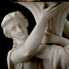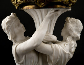 Lampada da tavolo con struttura in biscuit scolpita a foggia di due fanciulle che sorreggono il lume. Applicazioni in bronzo dorato e paralumi in vetro e vetro opalino, XX secolo, altezza cm 75
