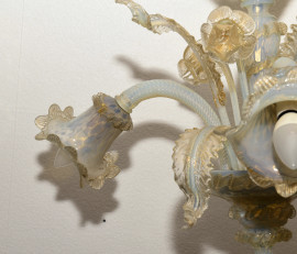 Lampadario in vetro di Murano a tre luci, cm 86x52 circa (difetti)