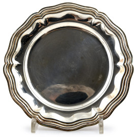 Lotto composto da 12 piattini in metallo argentato dal profilo orlato, diametro cm 15