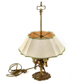 2) lampada da tavolo in bronzo dorato a quattro luci e paralume in tessuto panna con bordi oro e verdeacqua, XX secolo, cm 52x32