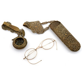 Lotto composto da portaorologio e da occhiali con portaocchiali in metallo finemente cesellato e traforato, XX secolo, misure massime cm 23,5x5,5