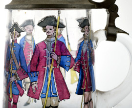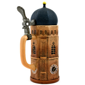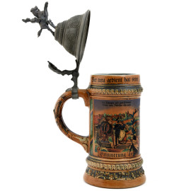 Lotto composto da tre boccali di birra, di cui due in ceramica e metallo e uno in vetro tipinto e metallo e una targa in latta Saalfelder, XX secolo, misure massime cm 29,5x21