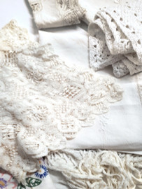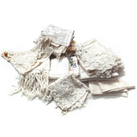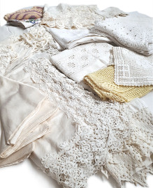 Lotto composto da una tovaglia in raso con tovaglioli e da numerosi tessuti ricamati