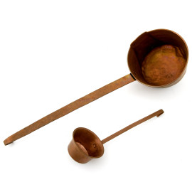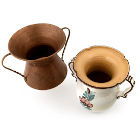Lotto di 3 oggetti in rame e un vaso in maiolica di Castelli, altezza massima cm 22, (difetti)
