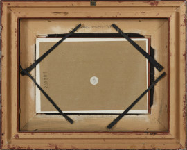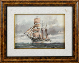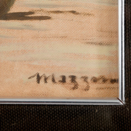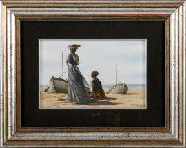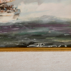 1) Veliero, tecnica mista su carta, firmato in basso a destra, cm 16x23, entro cornice; 2) Donne in riva al mare, acrilico su cartone telato, firmato in basso a destra, 19,5x28,5, entro cornice