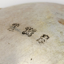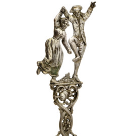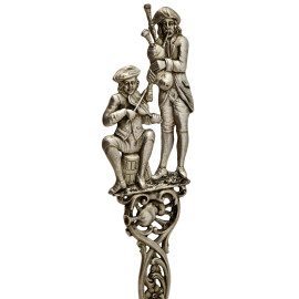 Lotto di due posate da portata in argento finemente cesellato con prese raffiguranti popolani che suonano e che danzano e cesello a motivi di paese. Manifattura francese, 1768, cm 23x7,5, peso complessivo gr200