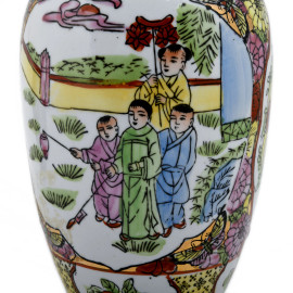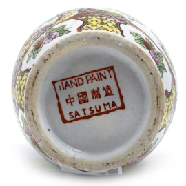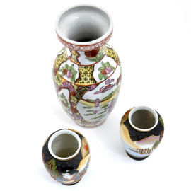 Lotto di due vasetti Satsuma e un vasetto in porcellana con decorazioni floreali e scene di genere, XX secolo, altezza massima cm21