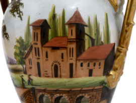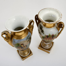 Lotto di due vasi Impero in porcellana nei toni del bianco e dell'oro con scene cortesi e vedute, altezza cm 28,5 (segni di usura e restauri)
