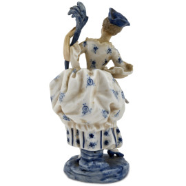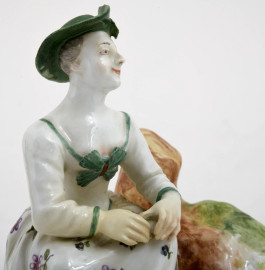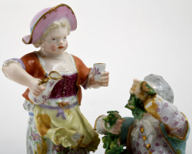 Lotto di quattro sculture in porcellana decorate in policromia, XIX-XX secolo: due in porcellana Meissen, una in porcellana Sevres e uno in porcellana Vecchia Vienna, misure massime cm 16x13x10,5, (difetti)