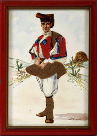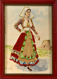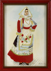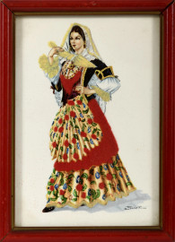 Lotto di quattro stampe colorate con inserti in tessuto rappresentanti costumi popolari, XX secolo, cm 14x10 entro cornice