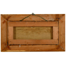 Marina con velieri, olio su tela applicata su cartone, XX secolo, cm 23x49 entro cornice, firmato in basso a sinistra