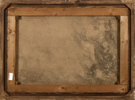 Natura morta, con brocche, fiori e frutta, olio su tela, XX secolo, cm 70x100, entro cornice