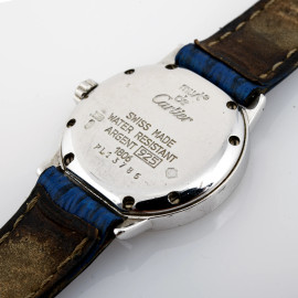 Orologio da polso Cartier con cassa in argento 925/000 e cinturino in pelle blu, misure cassa diametro mm 270, (lievi segni di usura, meccanismo da revisionare)