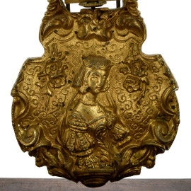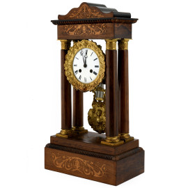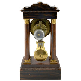 Orologio da tavolo in legno scolpito e intarsiato con pendola inserti in metallo dorato e quadrante circolare con numeri romani, cm 46,5x24,5x14, (da revisionare)