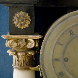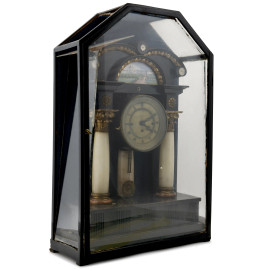 Pendola da camino a due colonne trabeate in alabastro con decorazione dipinta a villa viennese. Quadrante in metallo dorato circolare con numeri romani. Entro teca in legno e vetro. XIX secolo, misure complessive cm 66,5x44x18, (difetti, da revisionare)