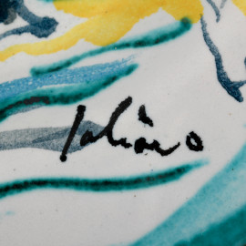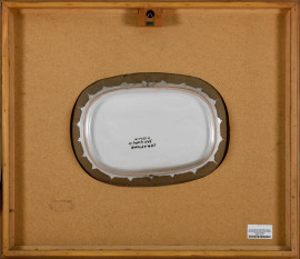 Piatto in ceramica San Giorgio Albisola raffigurante lotta tra cavalli, firmato in basso a destra, cm 30x41 entro cornice a bacheca (cm 59x68)