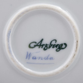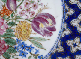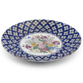 Piatto in porcellana dipinta a mano con tesa a motivi geometrici e composizione floreale al cavetto, XX secolo, diametro cm 30,5