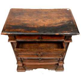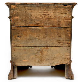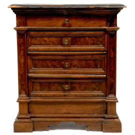 Piccola cassettiera in noce tinta a radica modanata a 4 cassetti, XVIII- XIX secolo, cm 88x78x45, (difetti, usura del tempo)