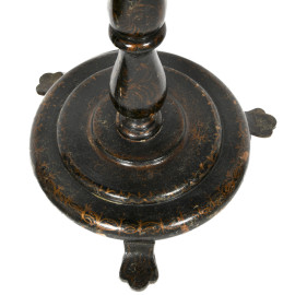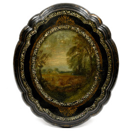 Piccolo tavolo a vela in papier maché con raffigurazione al piano di paesaggio campestre, fusto a balaustro e base circolare poggiante su tre piedini, XIX secolo, cm 70x64x53,5, (difetti)