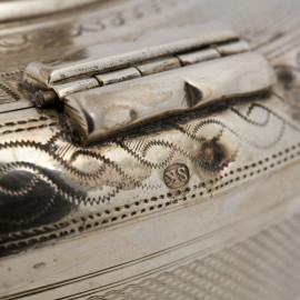 Portabonbon in argento con presa a foggia di leone poggiante su quattro piedini, XIX secolo, cm 14,5x12x14, peso gr 490