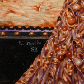 Profilo di donna, tecnica mista su carta applicata su cartoncino, firmato e datato 89 in basso a sinistra, cm 17,5x12,5, entro cornice
