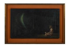 Romano Parmeggiani (Venezia, 1930 - Vicenza, 1992) , Figura nel bosco, olio su tavola, cm 53,5x87, entro cornice