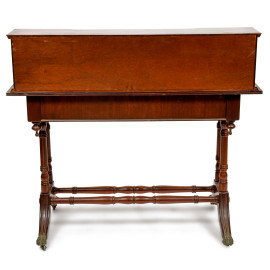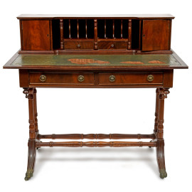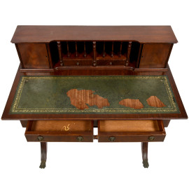 Scrittoio in mogano a due cassetti con piano in cuoio verde. Alzata scandita da due sportelli laterali e coppia di cassetti centrali sormontati e affiancati da vani. Gambe raccordate da traverse tornite. XX secolo, cm 98x106,5x60,5 (difetti e rotture al piano)
