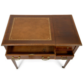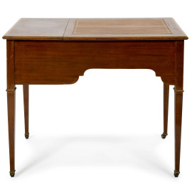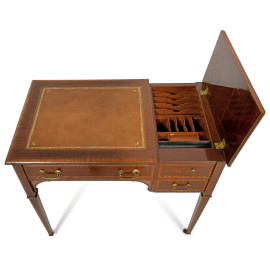 Scrivania scrittoio in mogano e filettature in bosso con fronte a tre cassetti. Il piano presenta rivestimento in cuoio e parte destra celante un vano con alzata organizzata in scomparti porta penne, documenti. Gambe lineari terminanti in rotelle. XX secolo, cm 73x83x51