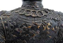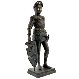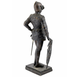 Scultura in bronzo brunito raffigurante cavaliere in armatura, XX secolo, altezza cm 51