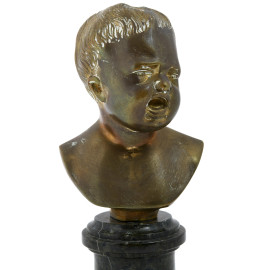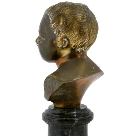 Scultura in bronzo dorato raffigurante bambino su base in marmo verde, XX secolo, altezza cm 22