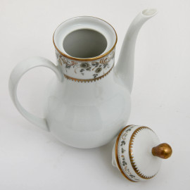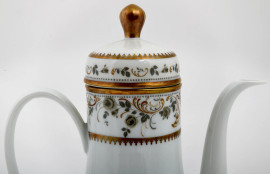 Servizio da caffè in porcellana Bavaria composto da una caffettiera, una lattiera, una zuccheriera, sei tazzine con piattini nei toni del bianco e oro e motivi floreali, XX secolo, altezza massima cm 24,5