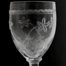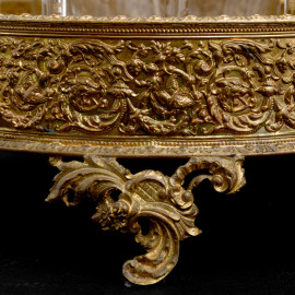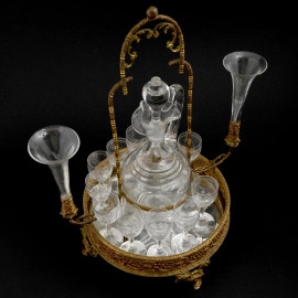 Servizio da liquore composto da versatoio e 11 bicchierini in vetro inciso entro struttura in metallo dorato finemente cesellato, XX secolo, cm 34x26x20